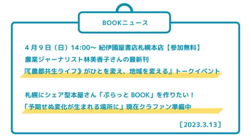 【NEWS01】4月9日(日)14:00~ 紀伊國屋書店札幌本店【参加無料】 札幌のキャスター・農業ジャーナリスト林美香子さんの最新刊『《農都共生ライフ》がひとを変え、地域を変える』トークイベント 札幌のキャスター・農業ジャーナリストの林美香子さんが2023…