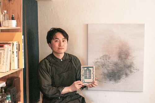 Vol.205 ノムスル 五十嵐 雄生さん 《ウイスキー抽象画》を描く五十嵐さん。背後の作品は「深めに入れたコーヒーをベースにエドワダラーやアードベックなどいくつかのウイスキーを合わせた」味わいを描いたもの。 [本日のフルコース]《ウイスキー抽象画》…