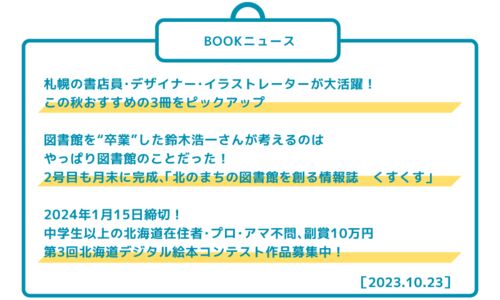 札幌の書店員・デザイナー・イラストレーターが大活躍! この秋おすすめの3冊をピックアップ 図書館を“卒業”した鈴木浩一さんが考えるのは やっぱり図書館のことだった! 2号目も月末に完成、「北のまちの図書館を創る情報誌 くすくす」 2024年1月15日締切!…