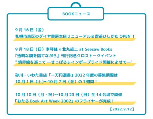 ・今年3回目の「Sapporoチャイルド・ライツ プロジェクト」 11月末までブックカバーを市内書店18店舗で無料配布中! ・砂川・いわた書店のアノ人気企画がとうとう本に! 岩田徹著『一万円選書』(ポプラ新書)が12月に刊行予定 ・車椅子の女性の夢を叶えたス…